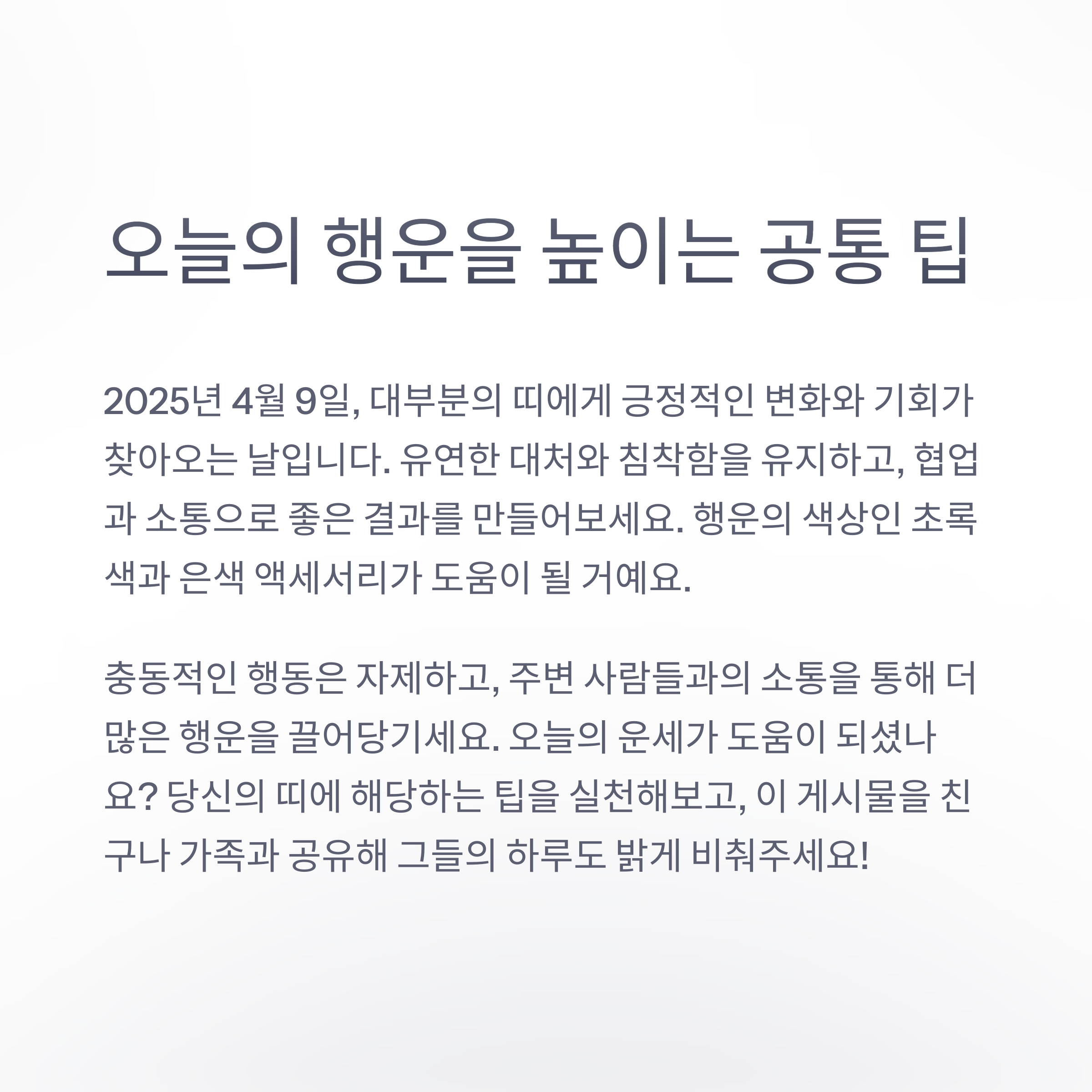 별빛 가득한 4월의 수요일, 여러분 안녕하세요! 오늘도 띠별 운세와 함께 하루를 시작해보아요. 봄바람처럼 상쾌한 기운이 필요한 날, 여러분의 오늘은 어떤 별자리의 보호를 받게 될까요? 함께 알아봐요!