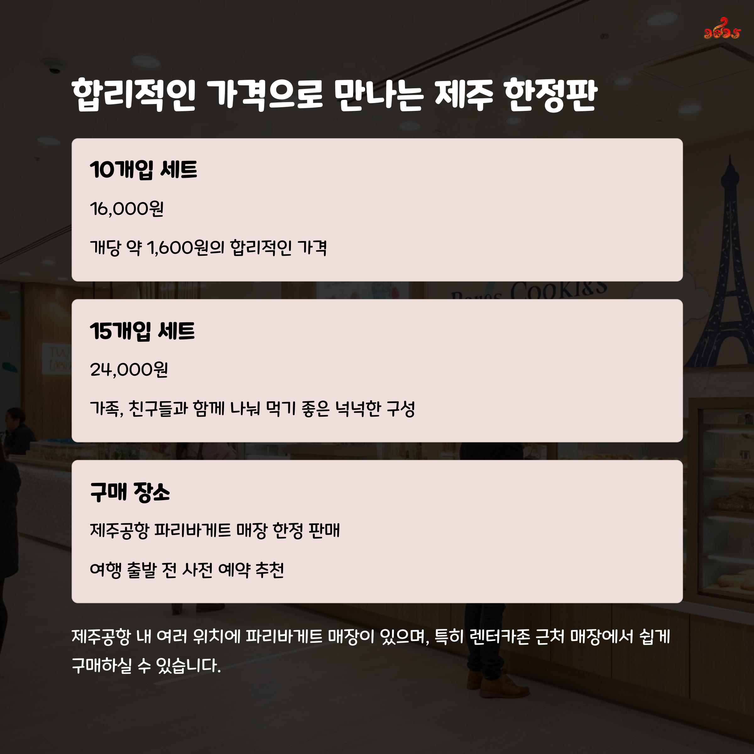 - 구매 방법: 파리바게트 앱에서 사전 예약 후 제주공항 내 매장에서 픽업 가능