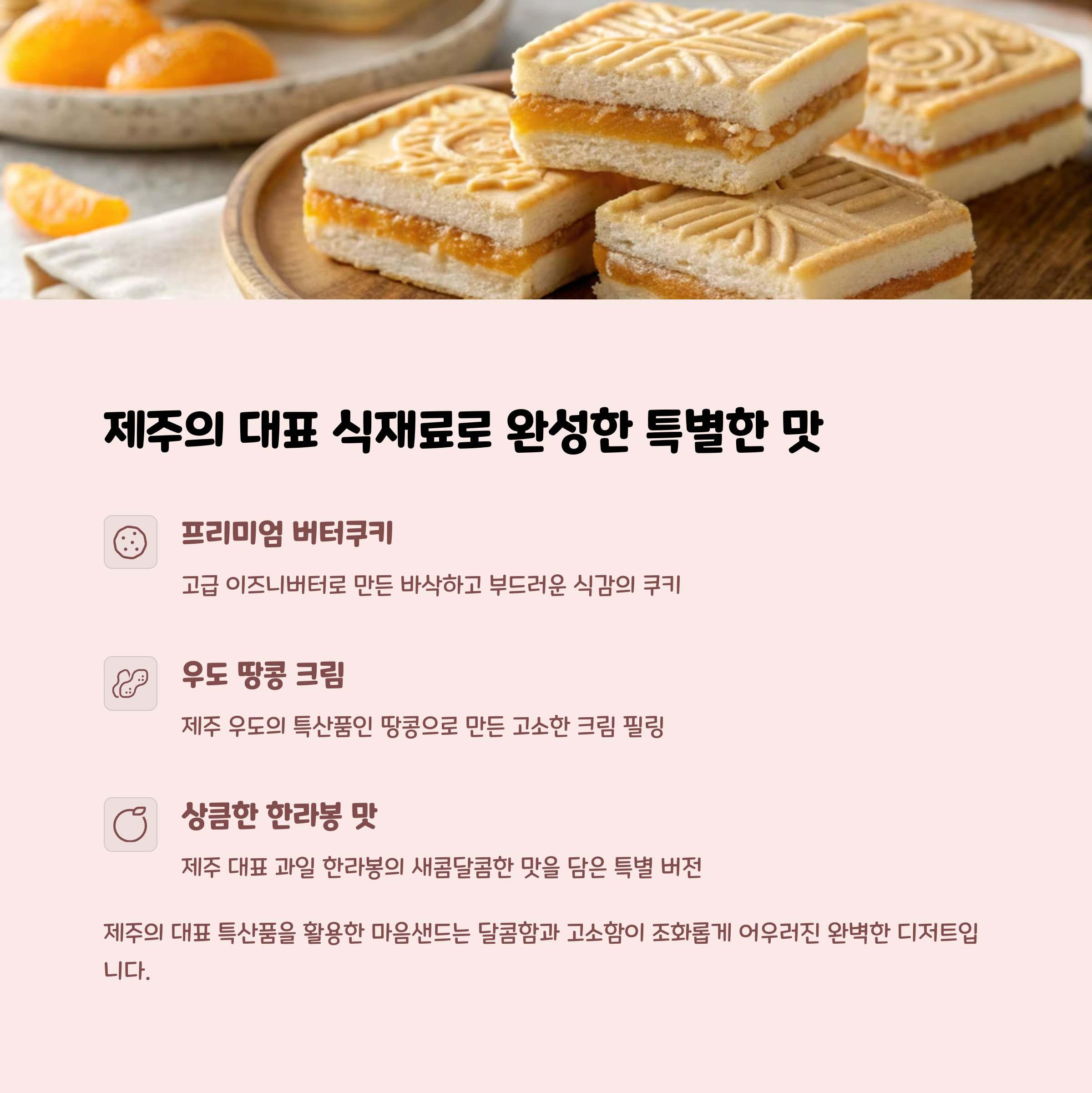 제주 마음샌드는 제주도에서 구매할 수 있는 대표적인 쿠키 선물입니다. 가장 큰 특징은 이즈니 버터와 우도 땅콩 크림이 들어 있어 입안에서 고소함이 퍼진다는 점! 특히 제주 여행을 마치고 돌아가면서 가족과 친지들에게 선물용으로 딱 좋아요. 고유한 제주 감성과 맛을 함께 담고 있는 이 제품은 여행객들 사이에서 꾸준히 인기를 끌고 있습니다.