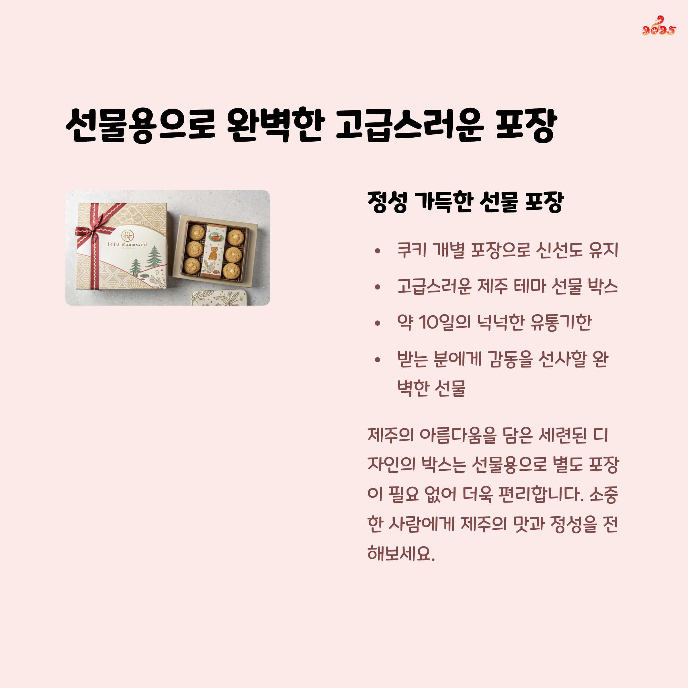 제주 마음샌드는 이미 고급스러운 포장으로 제공되므로 별도의 추가 포장은 필요하지 않습니다. 특히 박스와 개별 포장이 잘 되어 있어 선물로 바로 전달하기 적합합니다.