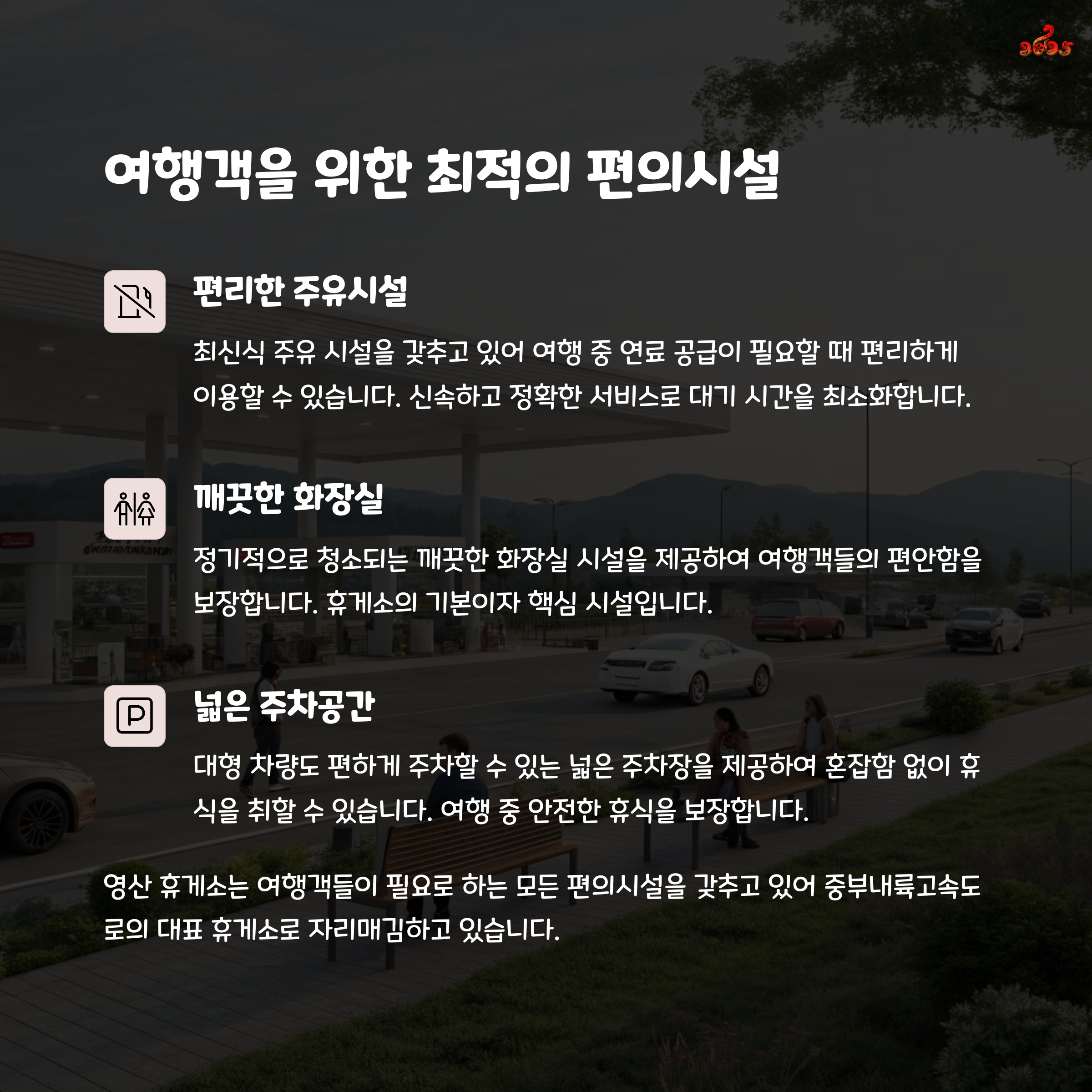 또한 편리한 EX-OIL 알뜰주유소와 LPG 충전소도 있어 차량 관리도 가능합니다.