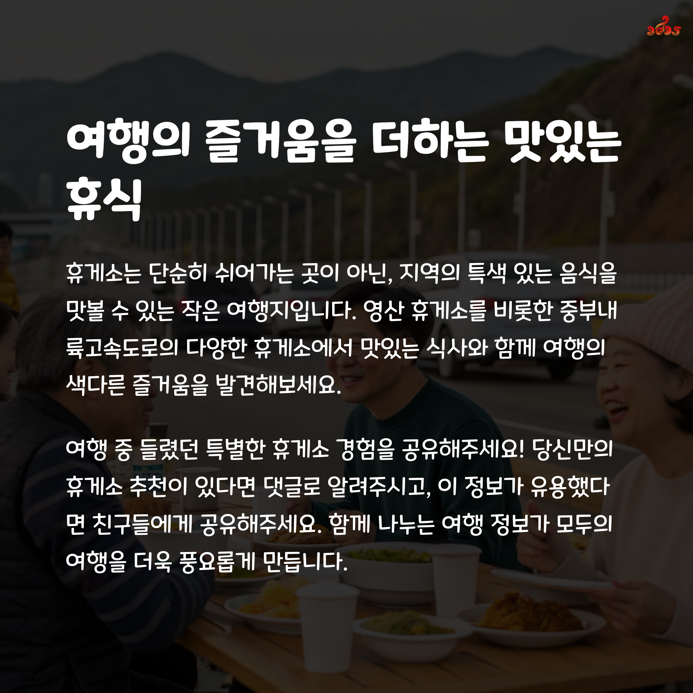 각 휴게소마다 고유의 특색을 지니고 있어 색다른 음식 경험을 제공하니 분명 만족하실 거예요.