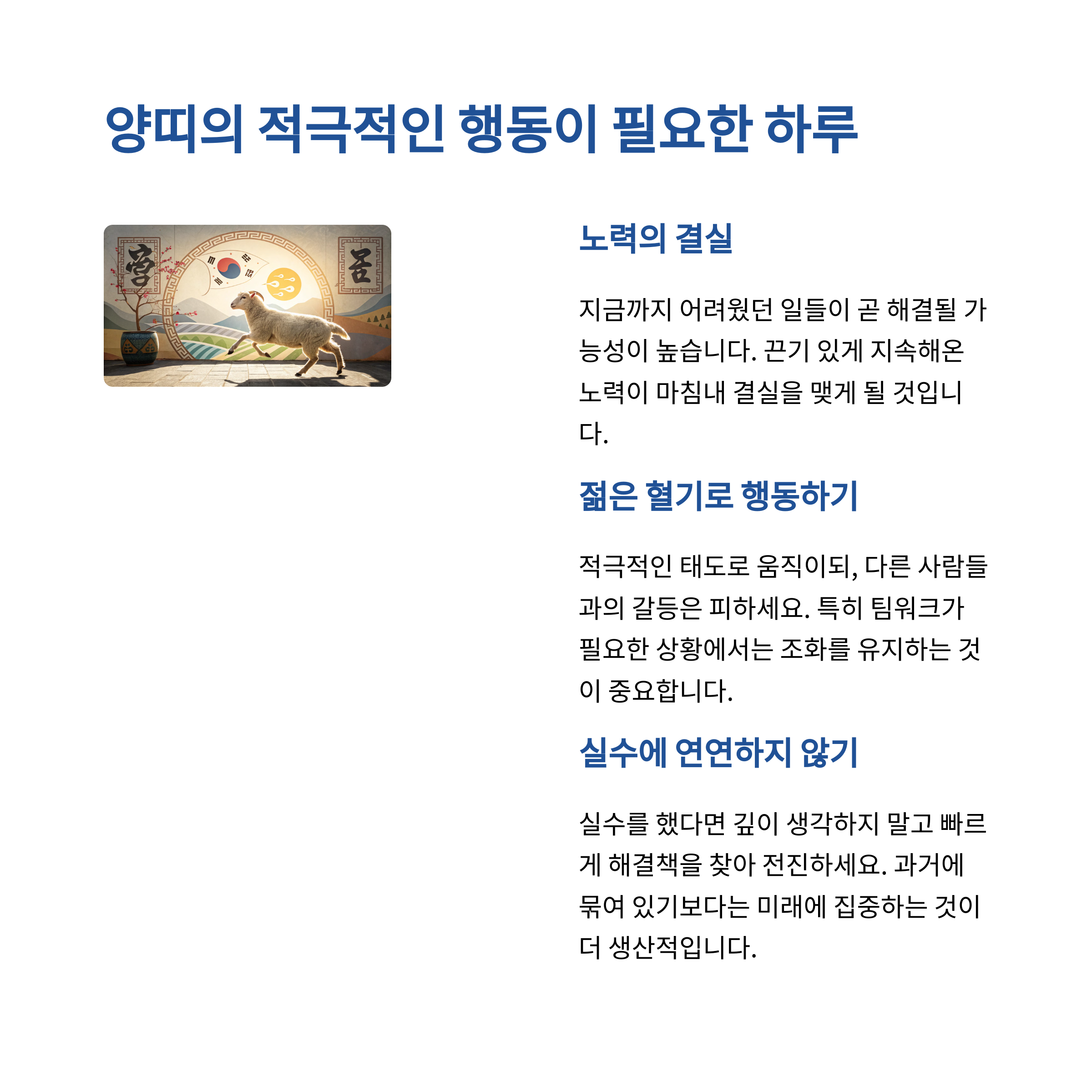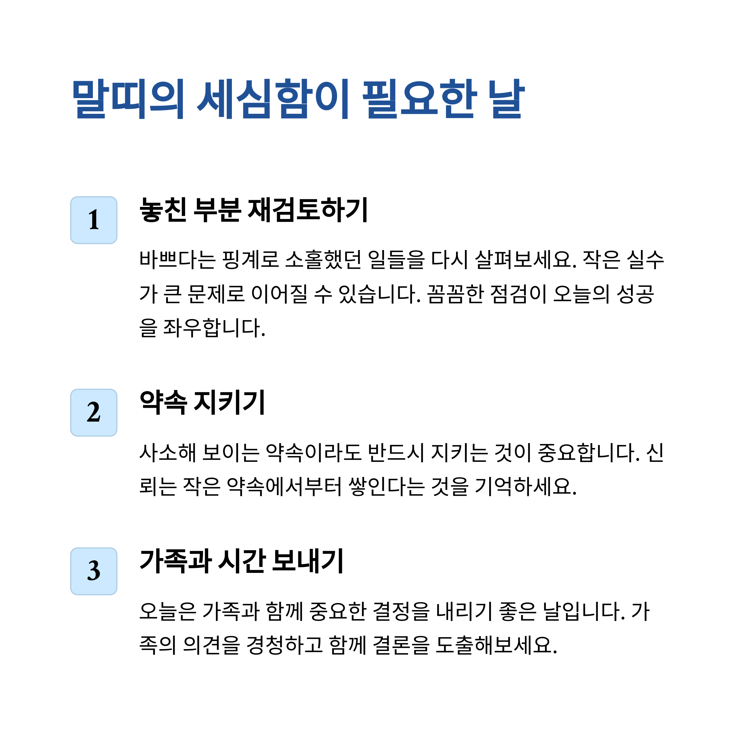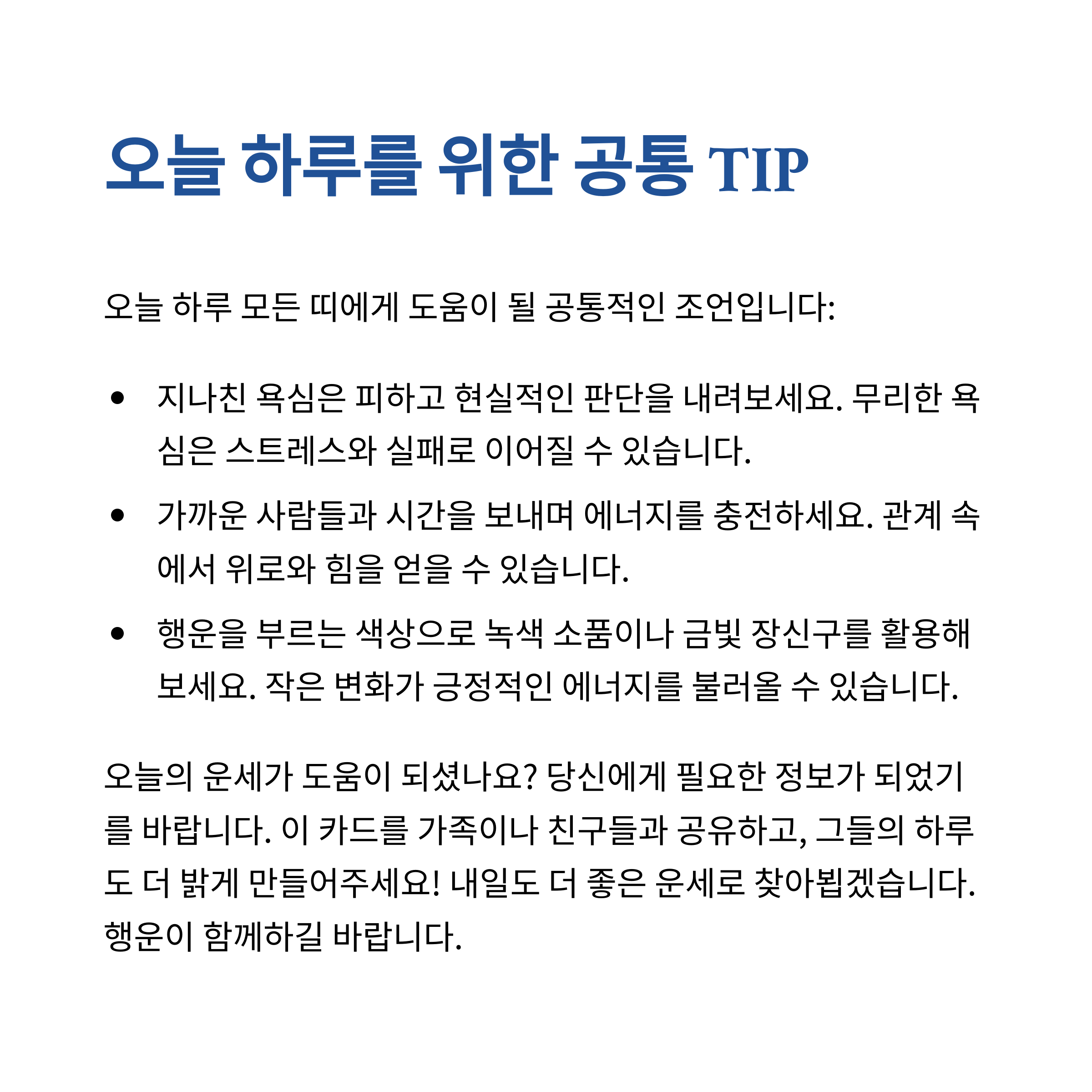 "여기까지 오늘의 띠별 운세였어요! 도움이 되셨나요? 좋은 기운은 살리고, 조심할 일은 미리 알아두면 더 즐거운 하루가 될 거예요. 내일도 여러분의 행운을 응원하며 또 찾아올게요! 오늘 하루도 파이팅하세요~ 💕 댓글로 여러분의 이야기도 들려주세요!"