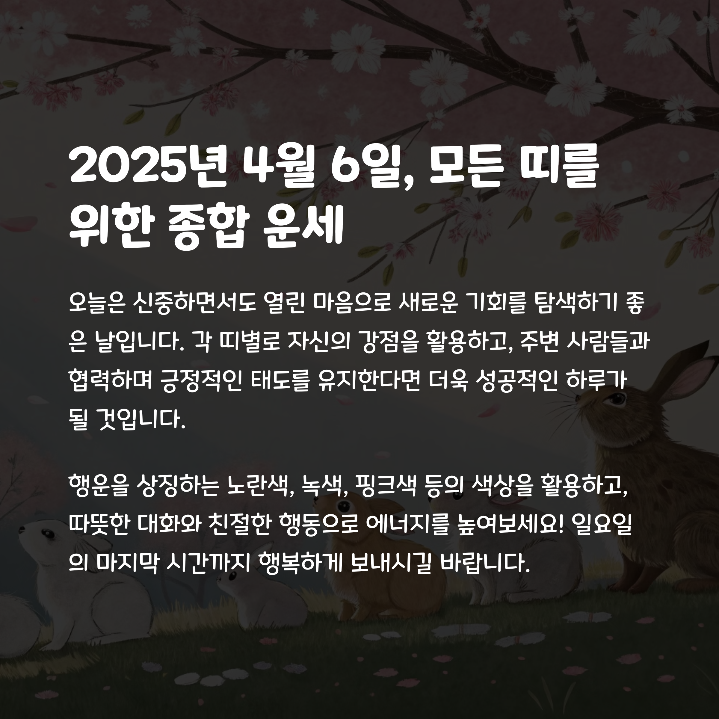 | 2025년 4월 7일 오늘의 운세 여러분의 행운을 응원합니다. (1) | 2025.04.07 |